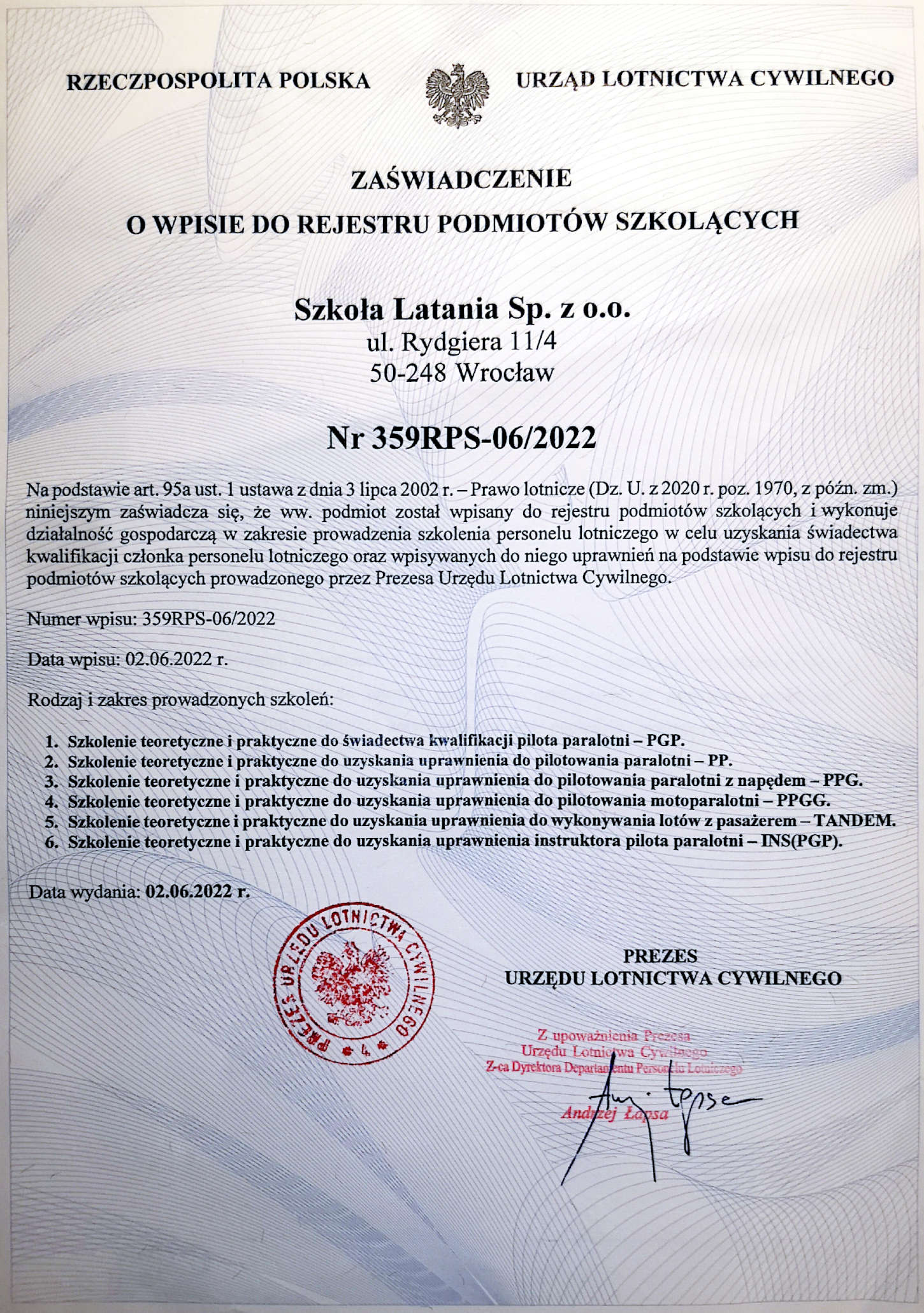 Szkoła szczyci się ogromnym doświadczeniem, co ma wpływ na bezpieczeństwo oraz efektywność nauki. Szkolimy od 1998 roku na wszystkich poziomach zaawansowania. Do lotów holowanych szkolimy na bardzo bezpiecznej, dwubębnowej wyciągarce w Mirosławicach pod Wrocławiem. Na wyjazdach zagranicznych starty są filmowane, a nagrany materiał analizowany na wykładach.